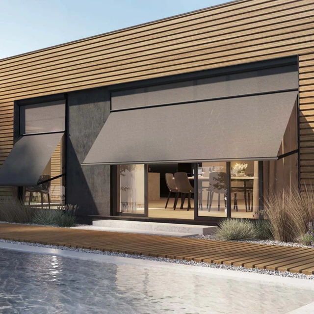 Eine Kombination aus Markise und Sichtschutz als zuverlässiger Sonnenschutz und ein Produkt, das eine Fassade schmücken kann.